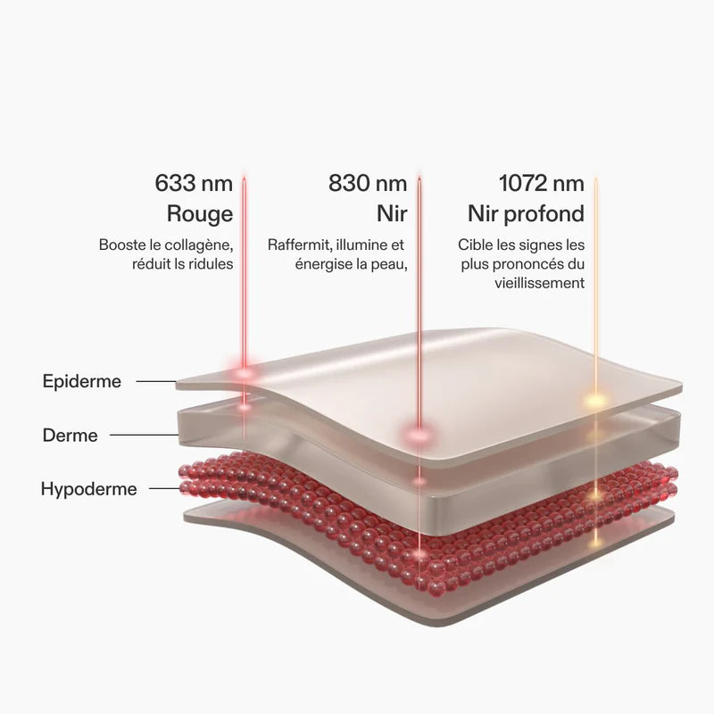 Ses longueurs d’onde rouges (620–630 nm) et infrarouges (850 nm) réactivent la régénération cellulaire en profondeur, sans chaleur, sans UV, sans détruire.